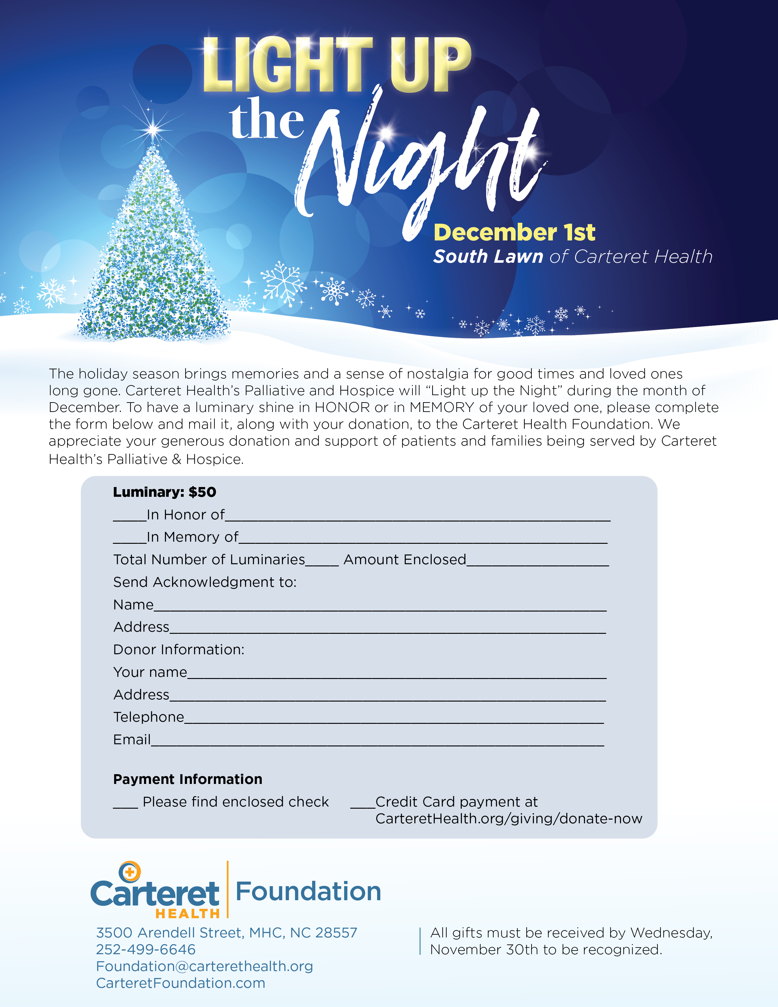 The holiday season brings memories and a sense of nostalgia for good times and loved ones long gone. Carteret Health’s Palliative and Hospice will “Light up the Night” during the month of December. To have a luminary shine in HONOR or in MEMORY of your loved one, you can submit your payment information online by clicking: