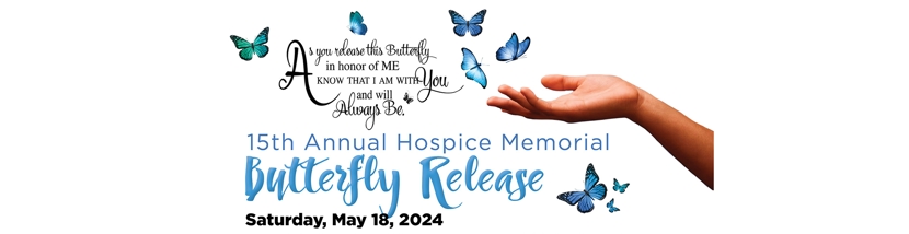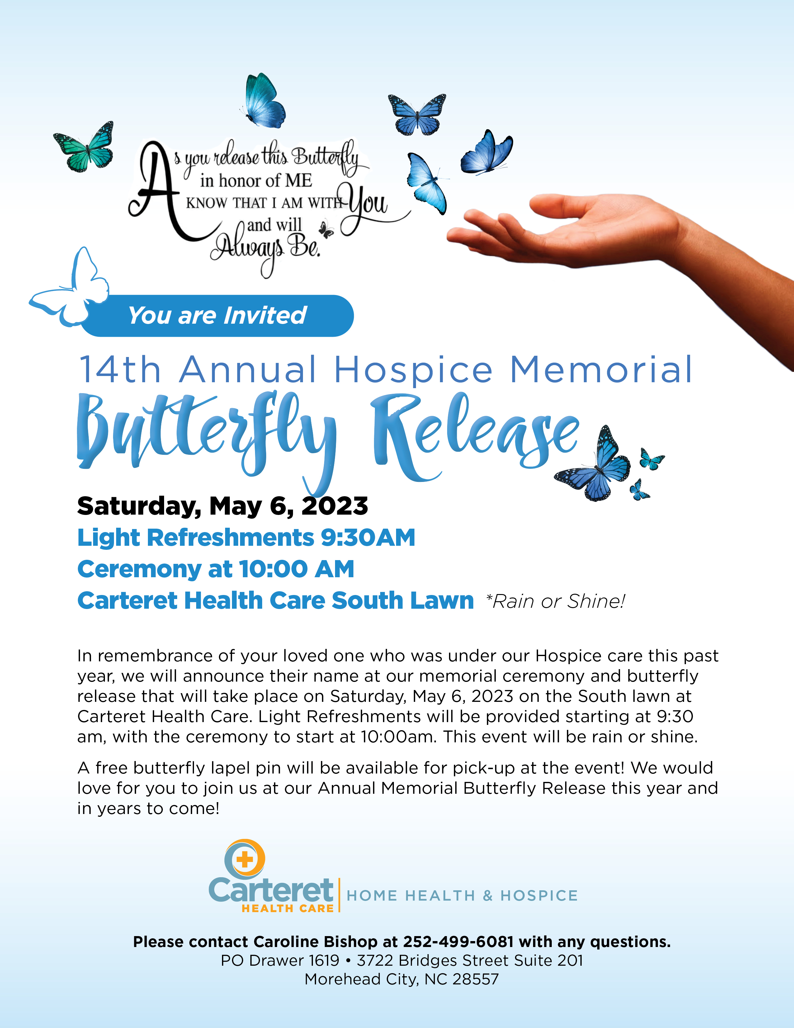 Carteret Health Care Home Health and Hospice is excited to announce the Butterfly Release! We will be holding the special ceremony at the Leon Mann Sr. Center, in Morehead City, and will read the names of the family and friends being honored and remembered as well as releasing beautiful painted lady butterflies as part of our ceremony. To honor or remember a loved one, purchase a butterfly to be released using the posted form, and if able, plan to join Carteret Health Care Hospice Staff on Saturday, May 18, 2024 at 9:30 AM for refreshments and 10:00 AM for the ceremony. Completed forms can be submitted prior to May 14th. Money raised will help support the patients and families our agency serves in Carteret County through home hospice services.